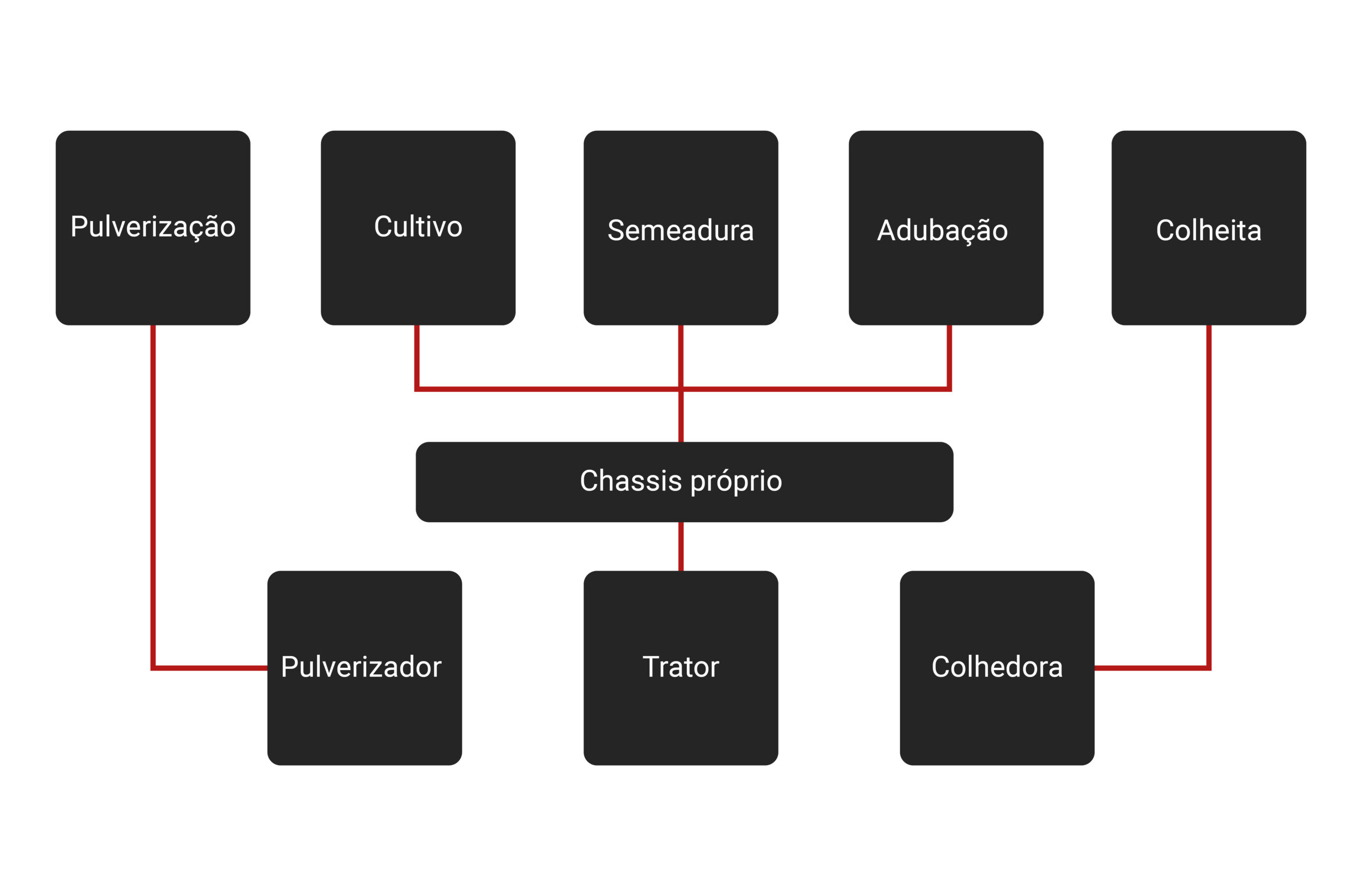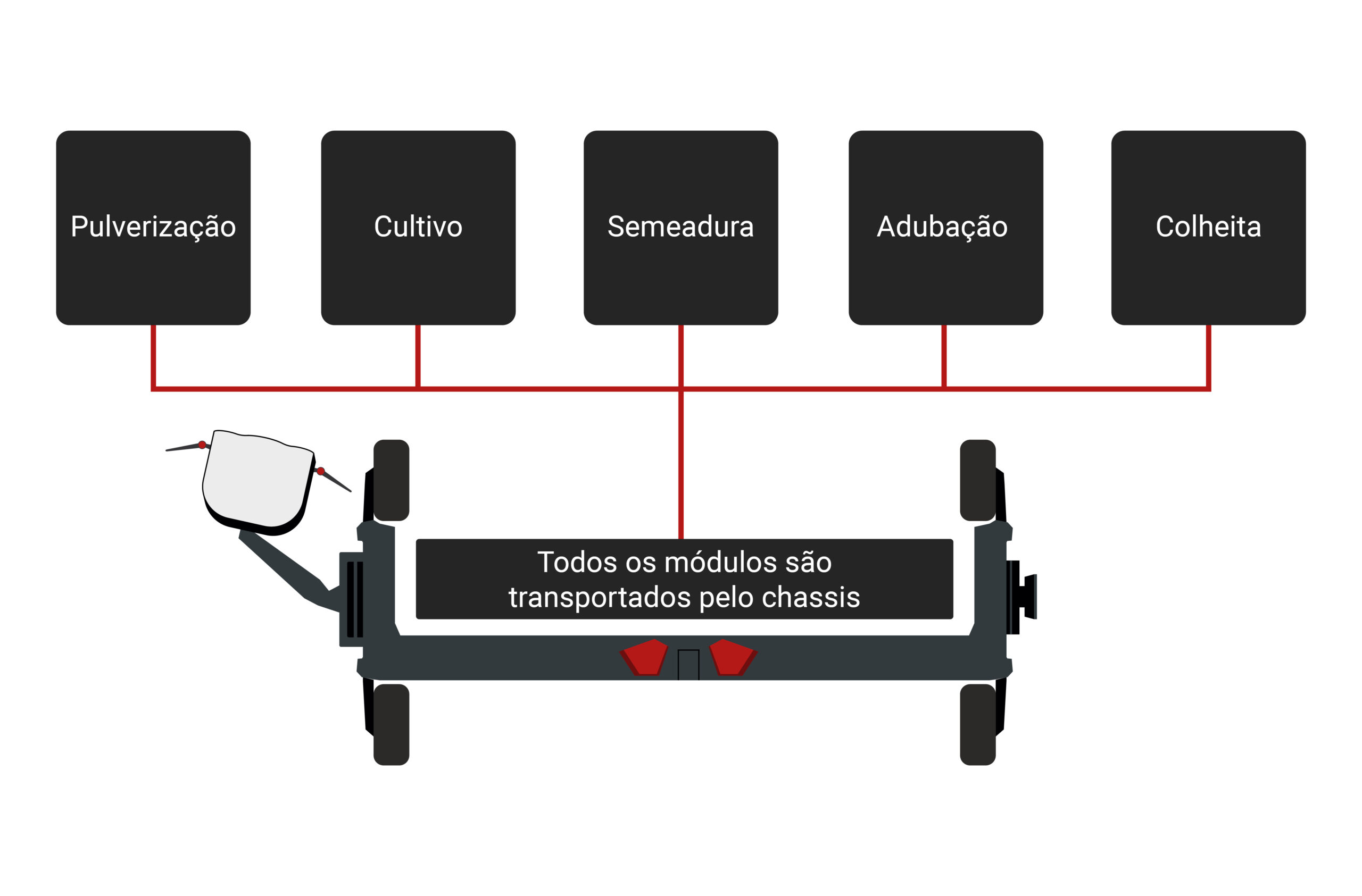 No centro do sistema está um veículo-portador com estrutura intercambiável, que realiza o preparo do solo, a semeadura, a proteção das plantas e a colheita com módulos acopláveis de parceiros renomados. A troca de um módulo pode ser feita por uma única pessoa em menos de 10 minutos — e, em breve, será totalmente automatizada.